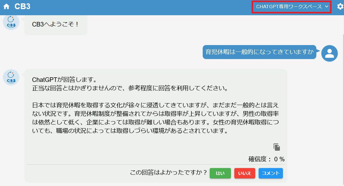 チャット画面のカテゴリ選択でChatGPT専用のワークスペースを選択することで直接ChatGPTに問い合わせを行う事ができます。