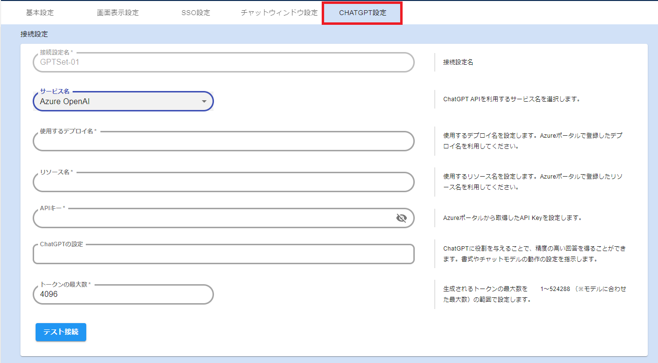 - 使用するChatGPTのモデルを設定してください。 使用する上での必須設定項目は以上ですが、その他ChatGPTを使用するための設定等につきましては機能説明書 管理者編の設定、ChatGPT設定「機能説明書 管理者編の設定、ChatGPT設定」もあせてご参照ください。