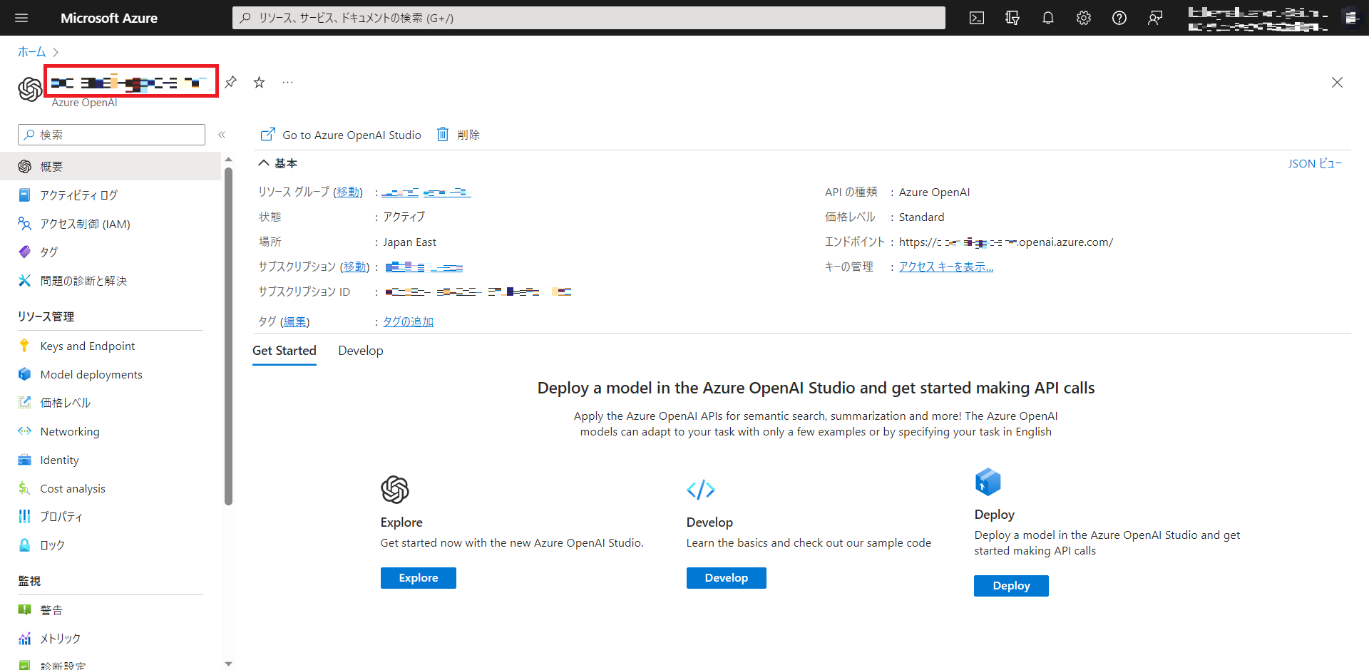 | ① | サービス名 | 利用するサービスを選択します。 (Azure OpenAIを選択する) |