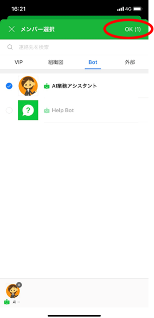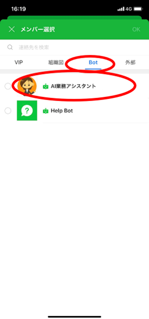 - Botのタブが選択されている事を確認し、Botを選択します。