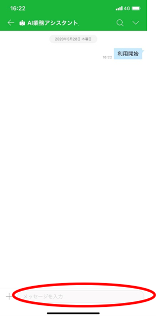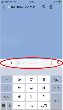 開いたチャット画面の下部にある入力欄から質問を記入、送信します。