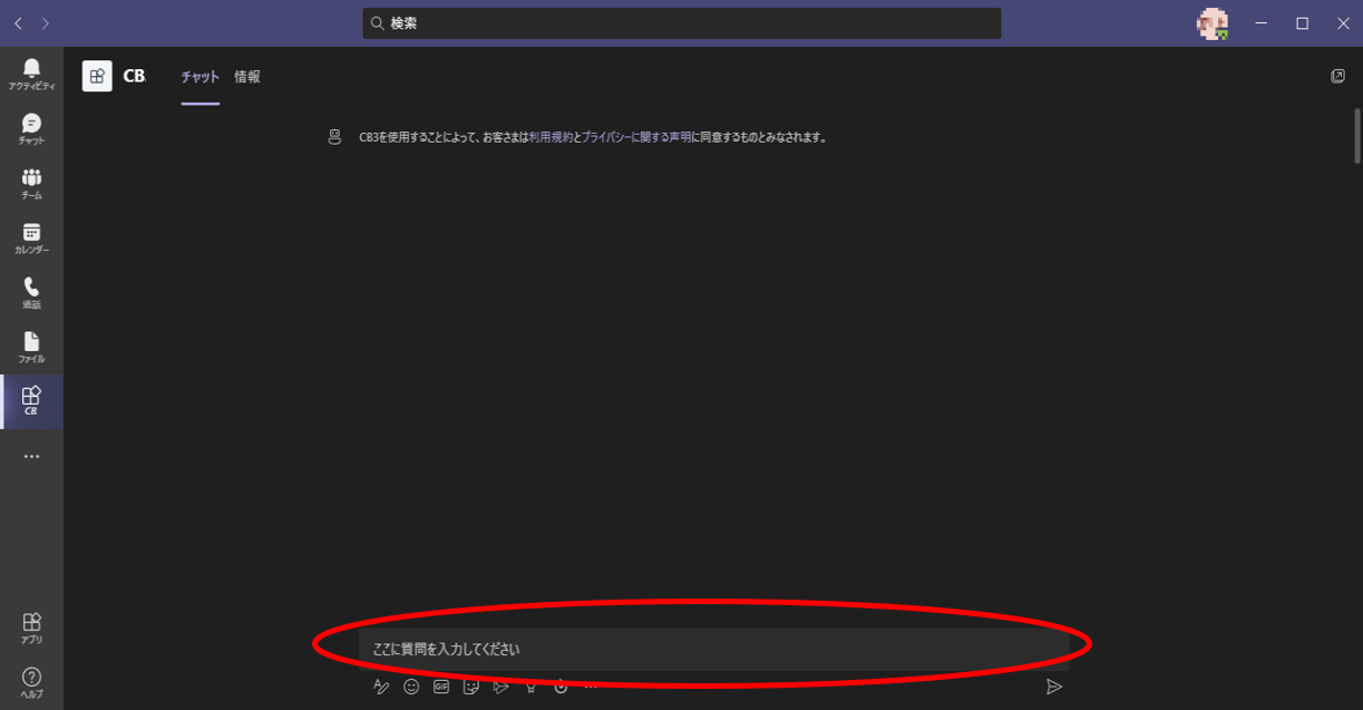 - 開いたチャット画面の下部にある入力欄から質問を入力してチャットを行います。