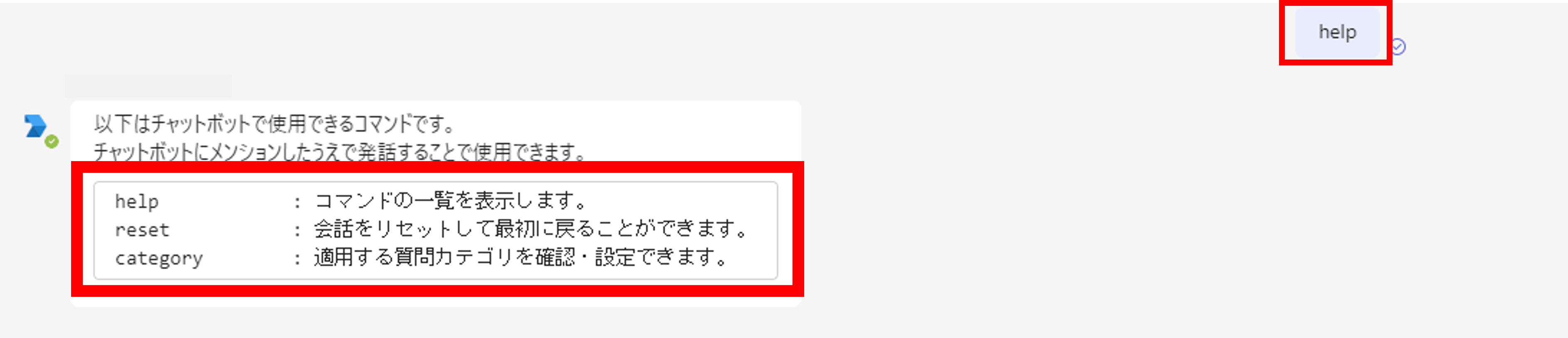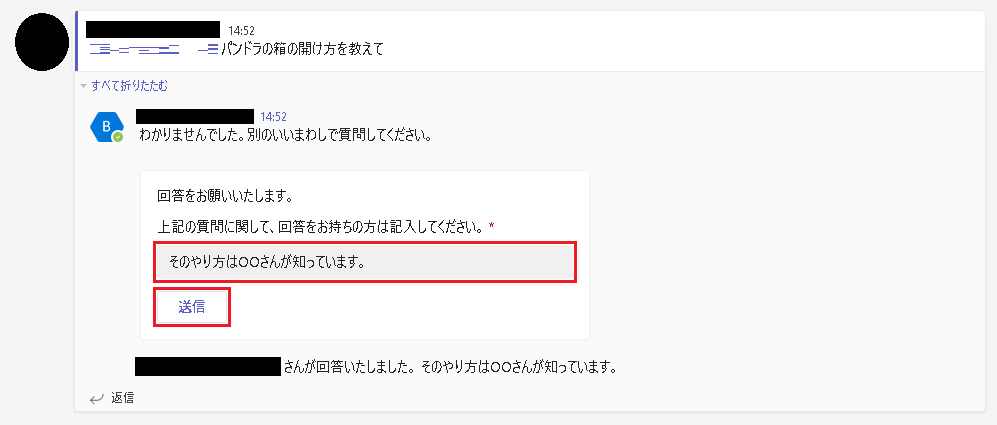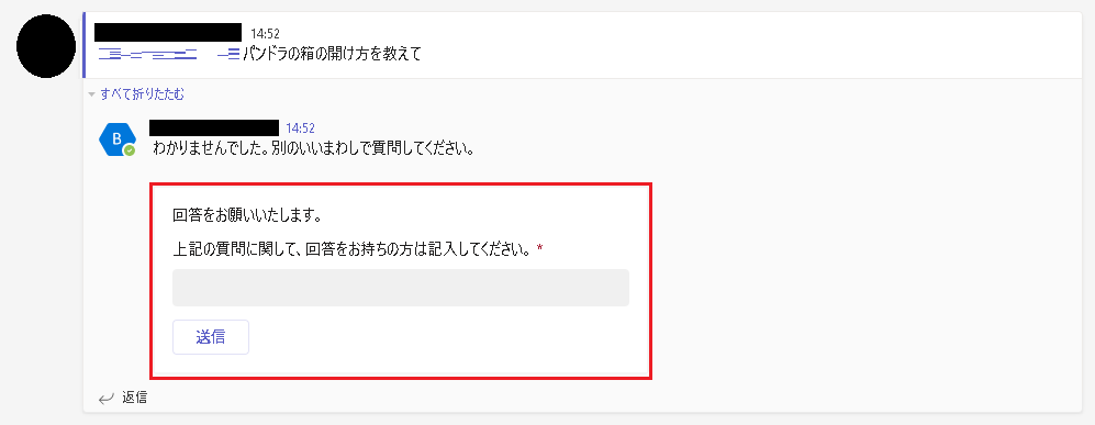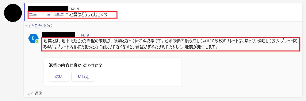 送信後、しばらくすると回答が表示されます。 - チャットボットからのメッセージに返信する場合もチャットボットにメンションする必要があります。
