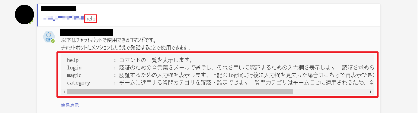 予約語の一覧はチャットボットにメンションした上で「help」と送信することで確認できます。