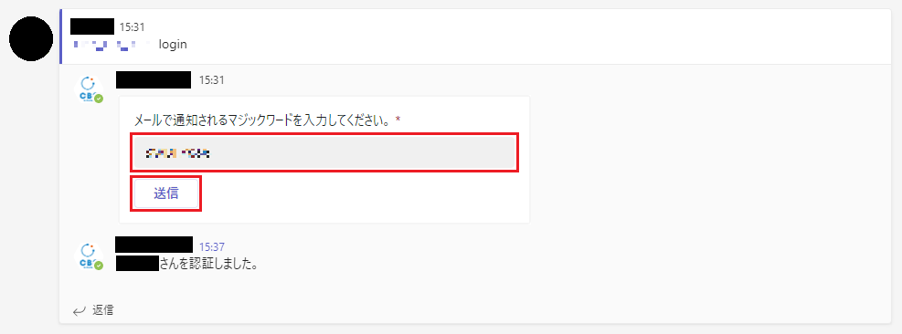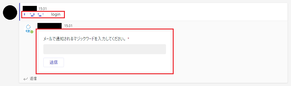 - チーム上でチャットボットにメンションを行い、「login」と送信します。※メンション先のチャットボット名は管理担当者にお問い合わせください。